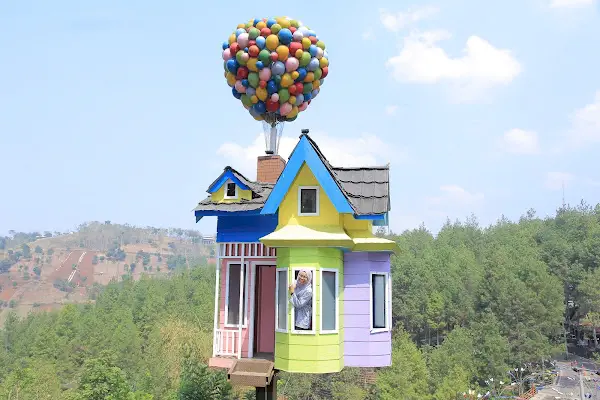 - Terinspirasi dari film animasi “Up”, spot foto ini menampilkan replika rumah yang terbang dengan balon-balon warna-warni di atapnya. Ini adalah salah satu spot foto yang paling populer di Dago Dream Park, terutama bagi anak-anak dan penggemar film tersebut.