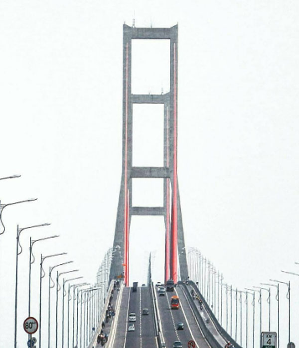 Jembatan Suramadu, singkatan dari Surabaya-Madura, adalah jembatan terpanjang di Indonesia dengan panjang mencapai 5.438 meter. Pembangunan jembatan ini dimulai pada tanggal 20 Agustus 2003 dan diresmikan pada tanggal 10 Juni 2009 oleh Presiden Susilo Bambang Yudhoyono. Proyek ambisius ini menelan biaya sekitar Rp4,5 triliun dan melibatkan teknologi serta sumber daya manusia dari berbagai negara.